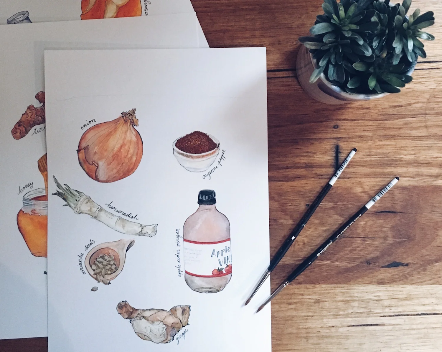 The advice was so helpful (I'm all better now!), and entirely achievable with a handful of ingredients from the pantry, that I thought I'd share some of the remedies with you, and painted some little illustrations to show them some love. There is nothing toxic in here, and no brand names, just nature's own cold-busters and immunity-boosters.